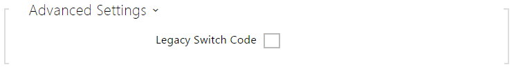 - Legacy Switch Code – enable the option to activate the first-listed switch code from the phone without being confirmed with *. When this box is checked, first code does not require confirmation by *. This setting does not apply to other switch codes listed and to numeric keypad code activation, those must be always confirmed by *. The Legacy switch code helps you keep back compatibility with earlier 2N intercom models.