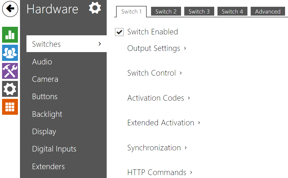 Switches provide a very flexible and efficient control of such intercom peripherals as electric door locks, lighting, additional ringing signalling, and so on. 2N IP intercoms allow you to configure up to 4 (depending on the model types) independent all-purpose switches.