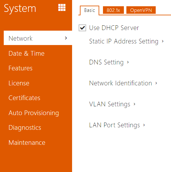 As the 2N IP intercom is connected to the LAN, make sure that its IP address has been set correctly or obtained from the LAN DHCP server. Configure the IP address and DHCP in the Network subsection.