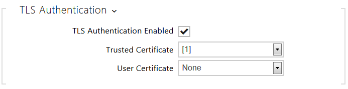 - TLS Authentication Enabled – enable authentication of network devices via the 802.1x EAP-TLS protocol. Do not enable this function if your LAN does not support 802.1x. If you do so, the intercom will become inaccessible.
