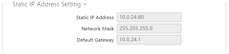 - Static IP Address – static IP address of the intercom, which is used together with the below mentioned parameters if the Use DHCP Server parameter is disabled.
