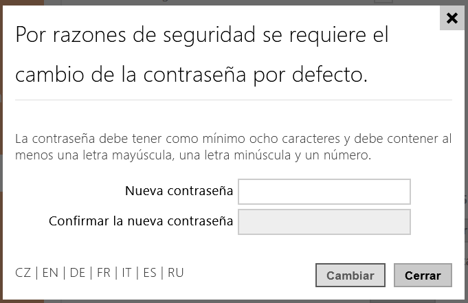 El intercomunicador requiere a la hora del primer inicio de sesión el cambio de contraseña. Solamente contraseñas fuertes son aceptables – que contienen al menos ocho caracteres que incluyen al menos una letra mayúscula, una letra minúscula y un número.