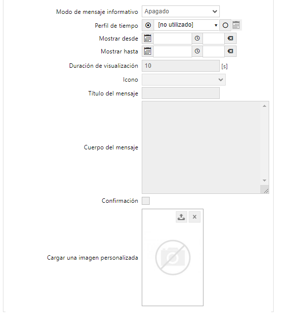 En cada una de las solapas se configuran los mensajes informativos específicos para cada uno de los siguientes sucesos: