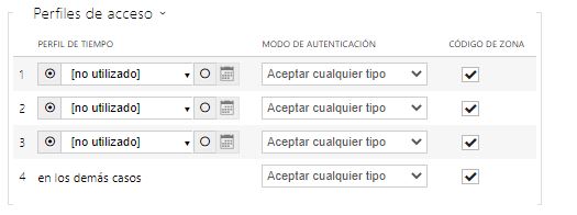 - Código de zona – permite el código de zona para la combinación del perfil de tiempo y la forma de autenticación en esta línea. El código de zona se puede utilizar luego en lugar del código PIN del usuario.