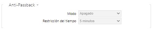 - Apagado – la función está apagada por defecto, el usuario puede utilizar la tarjeta de acceso u otra autenticación para acceder a la entrada a la zona por segunda vez, sin que la haya abandonado anteriormente.