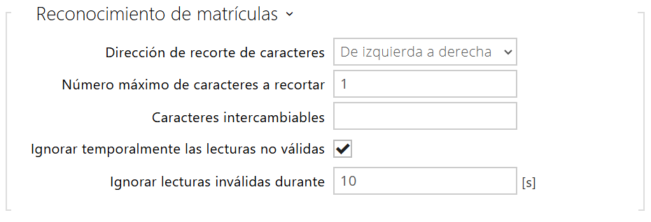 - Caracteres intercambiables – define los pares de caracteres intercambiables entre sí para los fines de la función del reconocimiento de matrículas. El primer carácter en la pareja será sustituido por el segundo carácter para los fines de búsqueda de coincidencia con las matrículas guardadas. El guión separa los caracteres en la pareja. Pueden introducirse varias parejas separadas por una coma. Los espacios serán ignorados. Por ej. O-0, I-1.