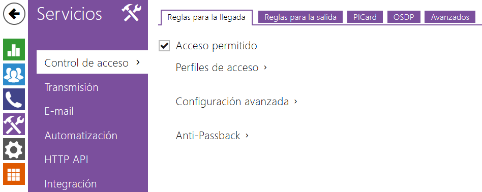 - Acceso permitido – permite cualquier acceso desde un lado determinado de la puerta (llegada, salida). En el caso de que el acceso no esté permitido, no es posible abrir la puerta desde este lado.