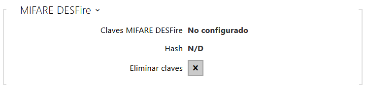 - Claves MIFARE DESFire – Indikuje stav konfigurace pro čtení MIFARE DESFire karet. Si falta alguno de los parámetros necesarios para la lectura de MIFARE DESFire en la configuración, o no es válido, el estado es No configurado. Si están presentes todos los parámetros y son válidos, el estado es Configurado.