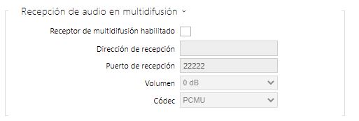 - Recepción de multicast habilitada – habilita la recepción de paquetes RTP en la dirección de multicast y puerto elegidos. El stream de audio recibido se reproduce también durante una llamada activa, cuando se mezclan los audios de ambas fuentes.