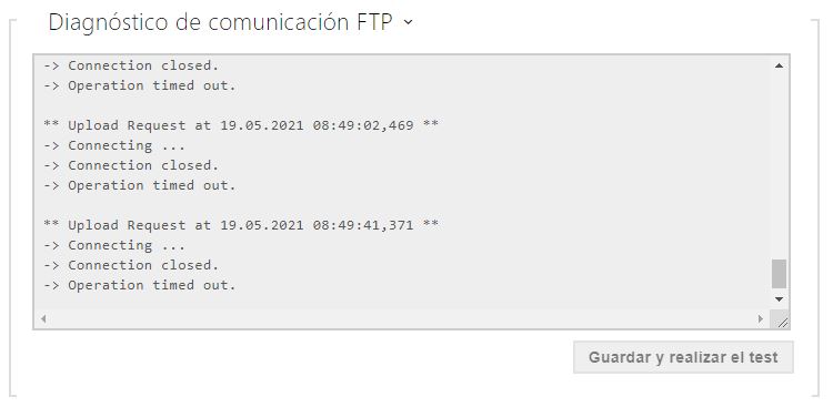 Tras pulsar el botón Guardar y realizar el test se guarda la configuración actual del servidor FTP, se descarga la imagen de la cámara y se guarda en el servidor FTP. Durante el guardado de la imagen aparece en la ventana de arriba el transcurso detallado de la comunicación con el servidor FTP.