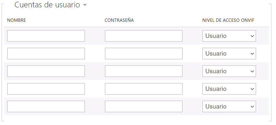 Para la función correcta de ONVIF hay que crear al menos una cuenta de usuario y configurar el nivel correcto de acceso (según la especificación de ONVIF y de VMS utilizada). Sin la configuración de las cuentas de usuario estarán disponibles solo las funciones básicas.