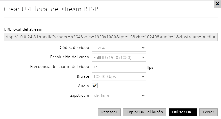 - Zipstream (disponible solo para H.264) – configuración del zipstream del URL local de stream, la cual tiene preferencia ante el valor introducido en la Configuración del stream.