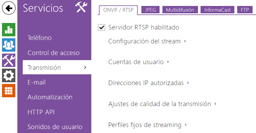 Los intercomunicadores 2N IP integran el servidor RTSP que se configura en esta solapa. El servidor RTSP permite realizar el stream tanto de audio, como de vídeo. Se puede elegir el modo de transferencia de datos, método y parámetros de compresión de vídeo y otros parámetros relacionados con el aseguramiento y calidad de transmisión.