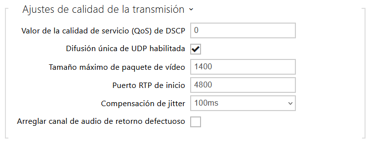 - Valor QoS DSCP – configura la prioridad de los paquetes de audio y vídeo RTP en la red. El valor configurado se envía en el campo TOS (Type of Service) del encabezado del paquete IP.