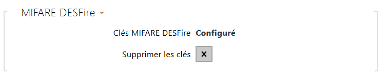- Clés MIFARE DESFire – Indique l'état de la configuration pour la lecture des cartes MIFARE DESFire. Si l’un des paramètres nécessaires à la lecture MIFARE DESFire est manquant ou invalide dans la configuration, le statut est Non configuré. Si tous les paramètres sont présents et valides, le statut est Configuré.