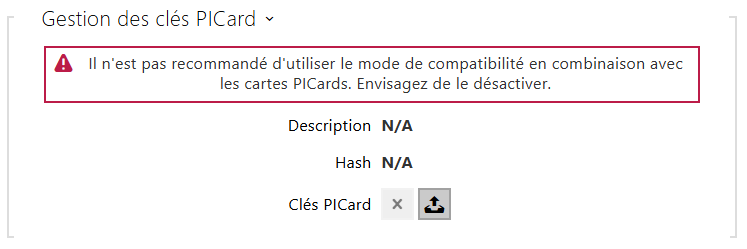 - Mode de compatibilité – la prise en charge des anciens modes de lecture des cartes. Il n'est pas recommandé de l'utiliser en combinaison avec des cartes PICard. Si ce mode est désactivé, les numéros de carte doivent correspondre exactement pour que l'autorisation réussisse.