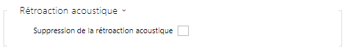 - Suppression de la rétroaction acoustique – définissez la suppression automatique du retour acoustique (généralement un sifflement) entre le haut-parleur de l'interphone et le combiné du téléphone s'il est situé à proximité immédiate de l'interphone. Ce mode est désactivé par défaut.