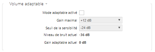 réglez le gain maximum à appliquer au volume principal en mode adaptable. - Seuil sensibilité – définissez le seuil de bruit ambiant qui détermine quand le volume commence à augmenter.