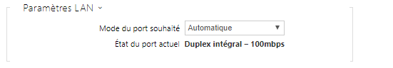- Mode de port requis – définissez le port de l’interface réseau par défaut (Automatique ou Half Duplex – 10 Mbps). Cela permet de réduire la vitesse de transmission à 10 mbps si l’infrastructure du réseau utilisée (câblage) ne peut pas supporter 100 Mbps.