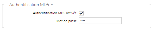 - Authentification MD5 activée – activez l'authentification des périphériques réseau via le protocole 802.1x EAP-MD5. Si votre réseau ne supporte pas 802.1x, n’activez pas cette fonction. Si vous le faites, l'interphone deviendra inaccessible.