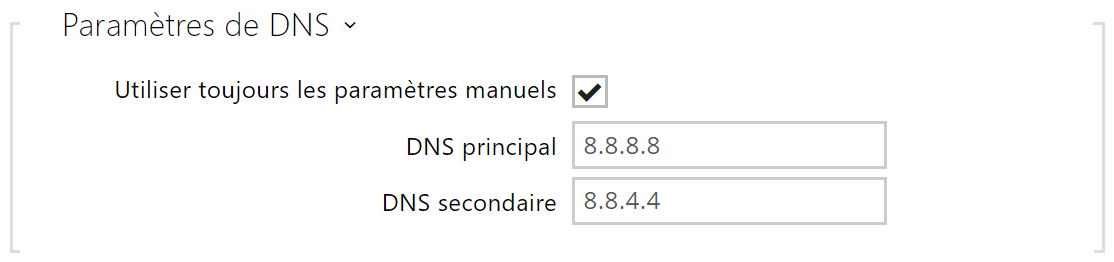 - DNS secondaire – l’adresse du serveur DNS secondaire, qui est utilisée si le DNS principal n’est pas accessible. En cas de réinitialisation sur les réglages d'usine, le serveur DNS principal sera défini sur 8.8.4.4.