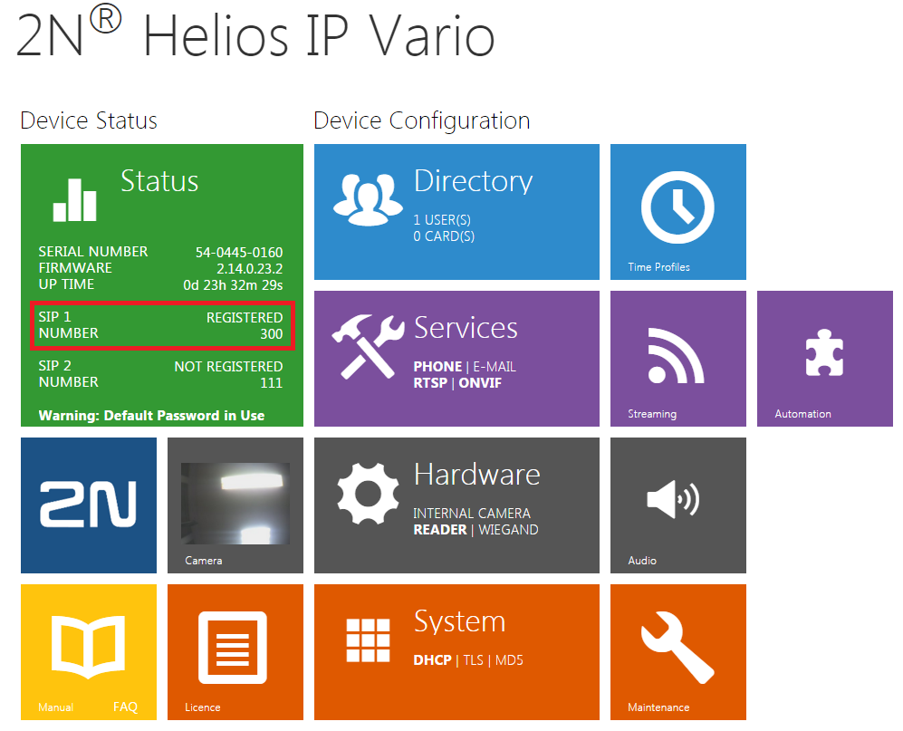 8. From side of the 2N IP intercom you can verify the successful registration in tab "Status" on the main page of web interface.