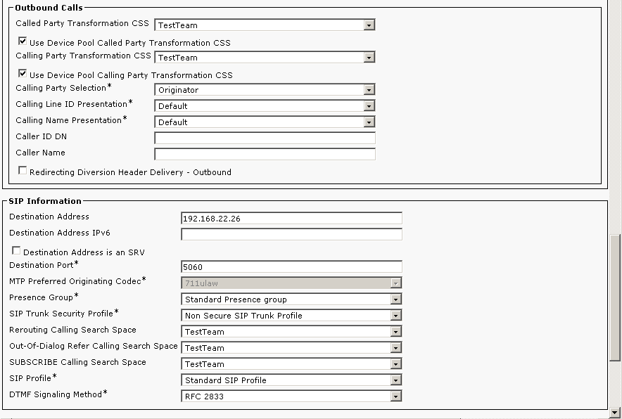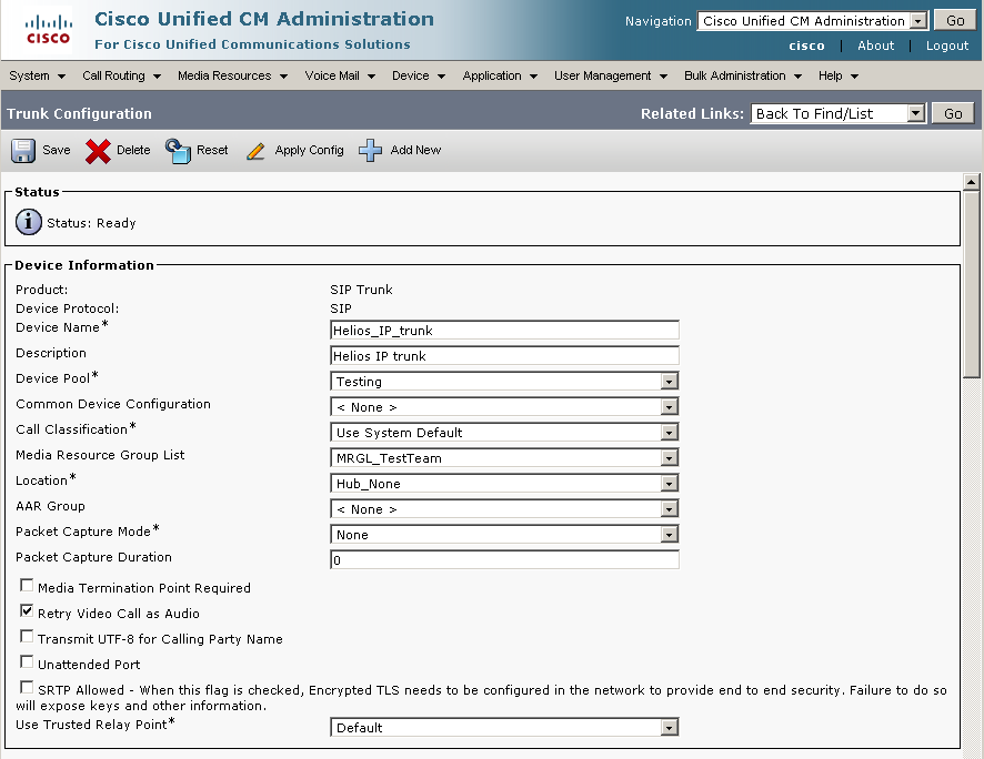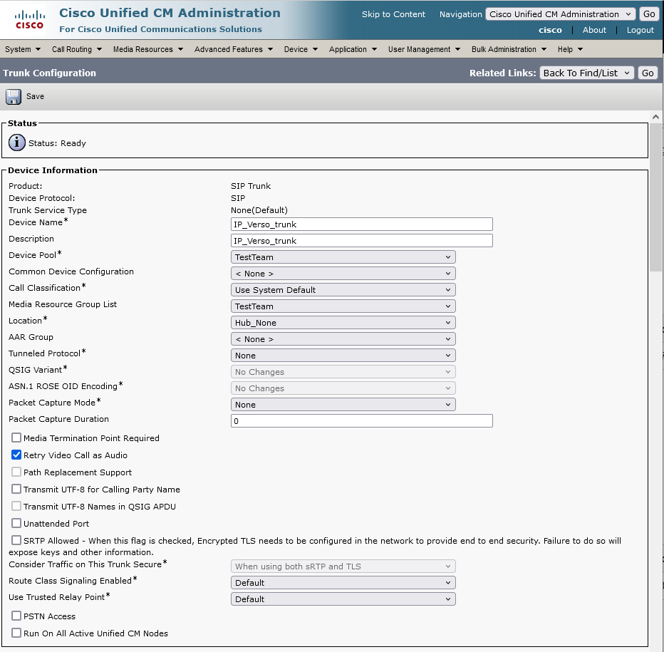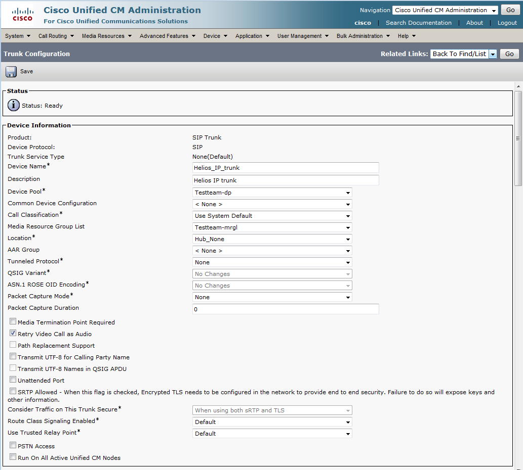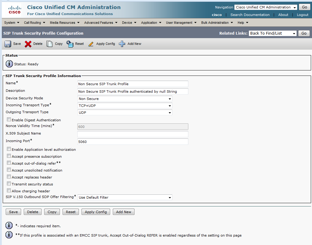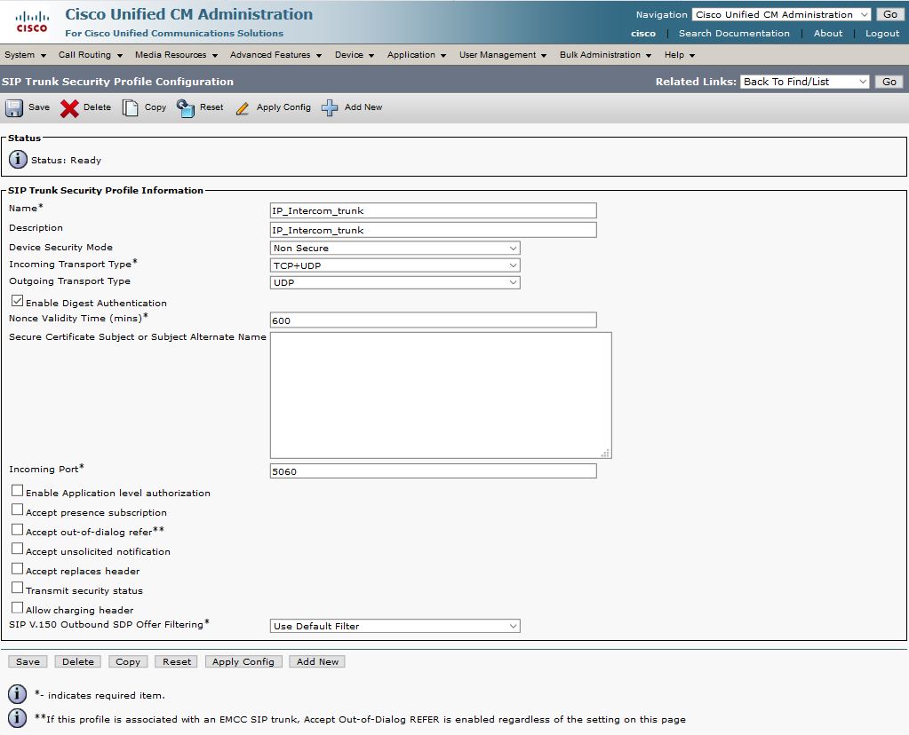 Configure trunk security (password which will be used for registration to the trunk). Security is configured in section System / Security / SIP Trunk Security Profile. Click on Add New. Configure the rest according to the pictures below.