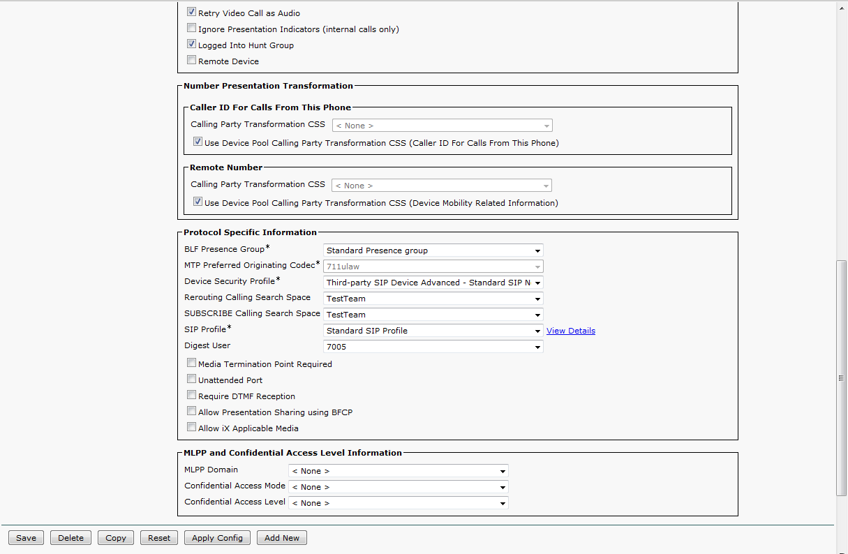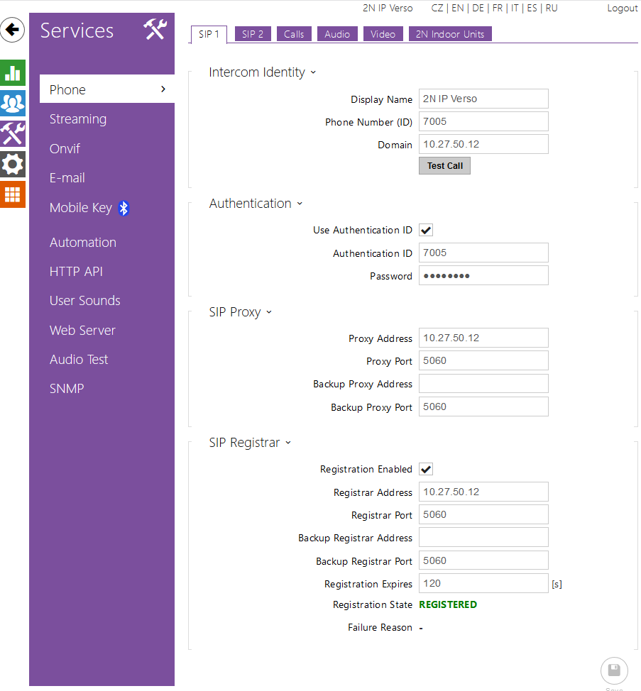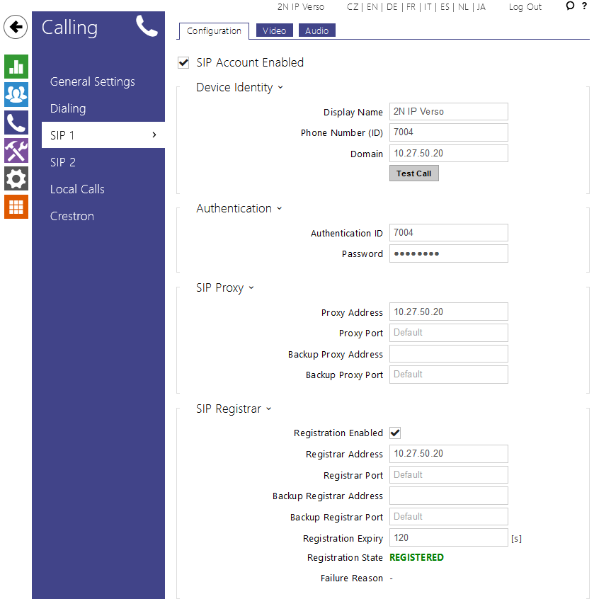 Now you can register the intercom to the newly created SIP trunk. Credentials for this example are 7999/7999 and address of CUCM 11 is 10.27.50.12. Instead of this address fill here address of your CUCM.