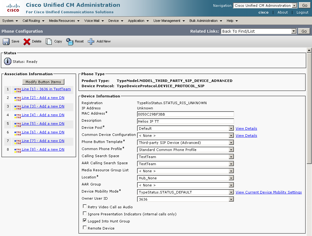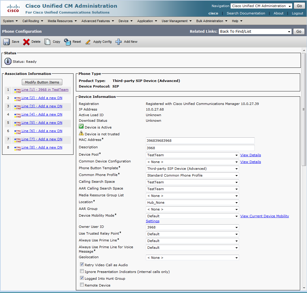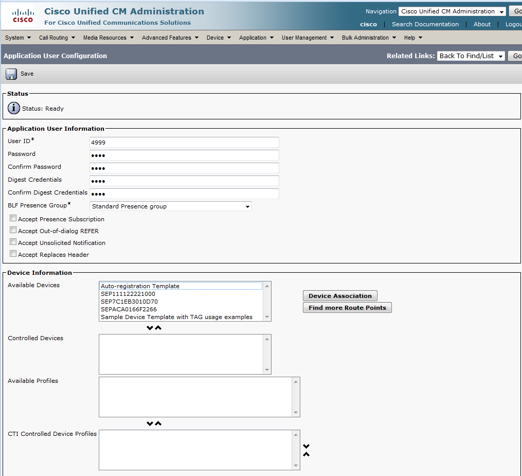 Now you can register the intercom to the newly created SIP trunk. Credentials for this example are 4999/4999 and address of CUCM 11 is 10.0.27.36. Instead of this address fill here address of your CUCM.