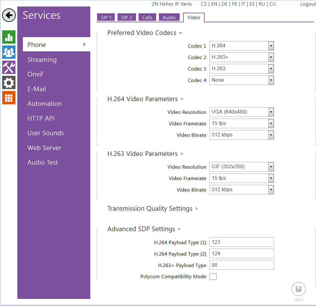 - 2N IP Intercom with a camera requires a Third-party SIP Device (Advanced) phone type.
