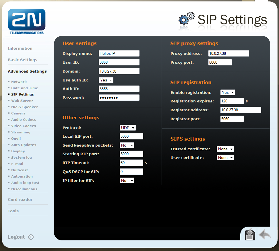The 2N IP Intercom was tested with Cisco 7941, Cisco 7970, Cisco 7985 Tandberg, Cisco 9971, Cisco IP Commnucator v7.0.3, CounterPath Bria v2.4, Grandstream GXV3140 v1.0.1, Snom 820 v8.1.3, Snom 870 v8.3.3 and Yealink VP-2009 v22.21.9.