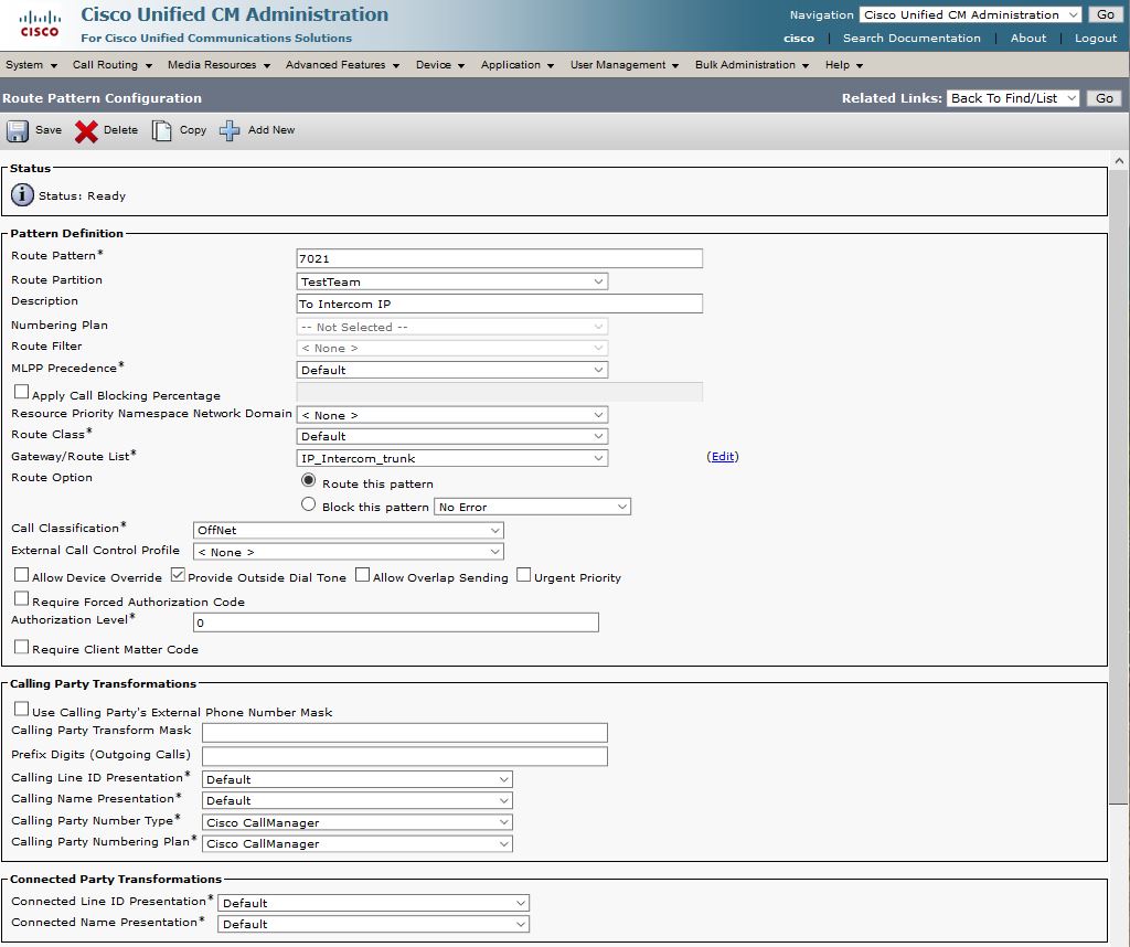 In next step create route pattern (number which will be called by the intercom). Add Route pattern in section Call Routing / Route/Hunt / Route Pattern. Click Add New. Continue with configuration according to pictures below.