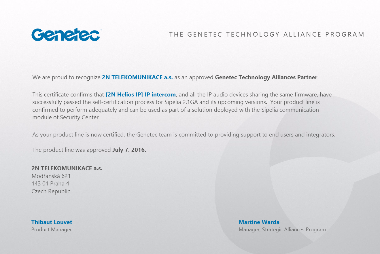 Genetec Sipelia (Security Center)2N IP Intercom VersionRegistrationCalls