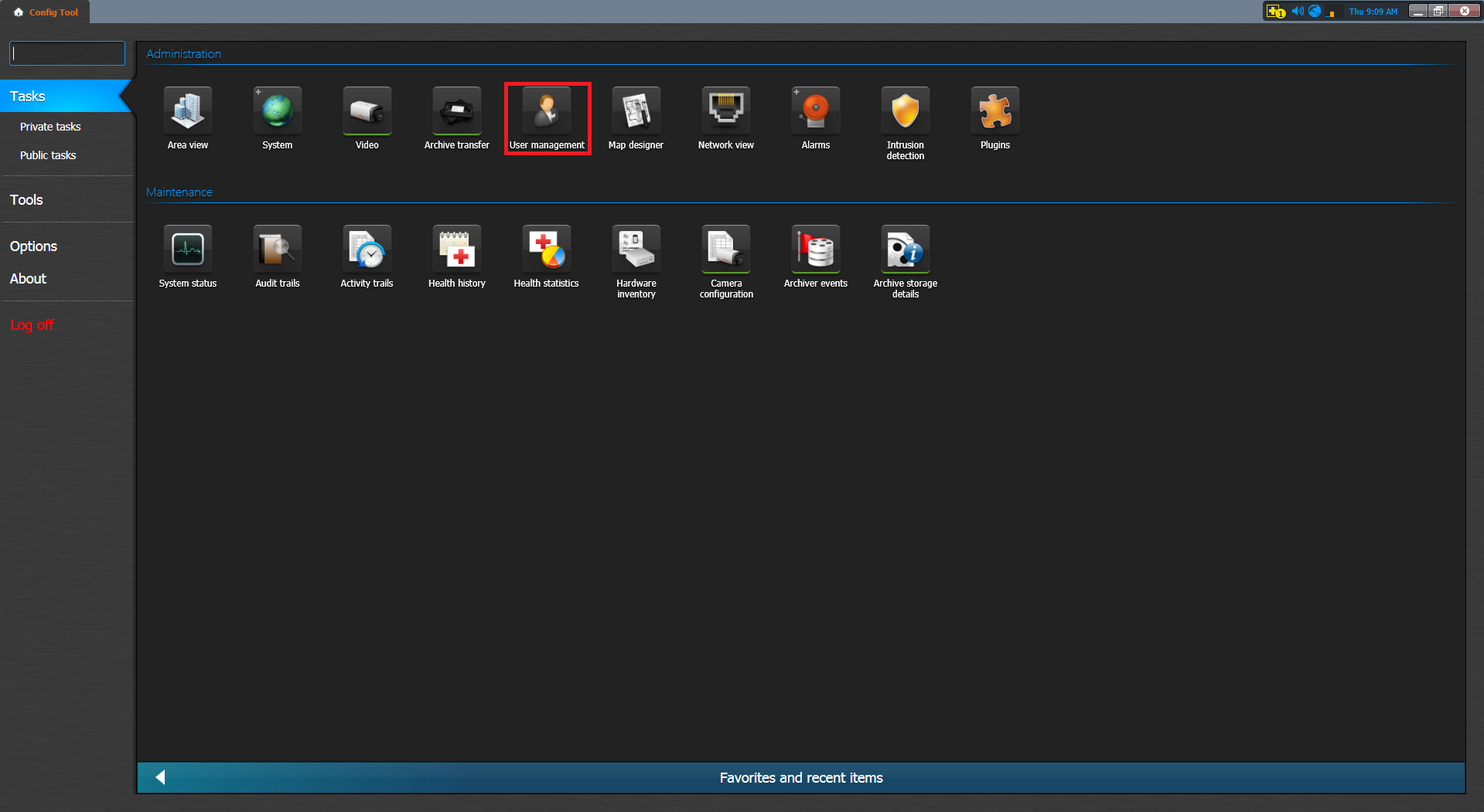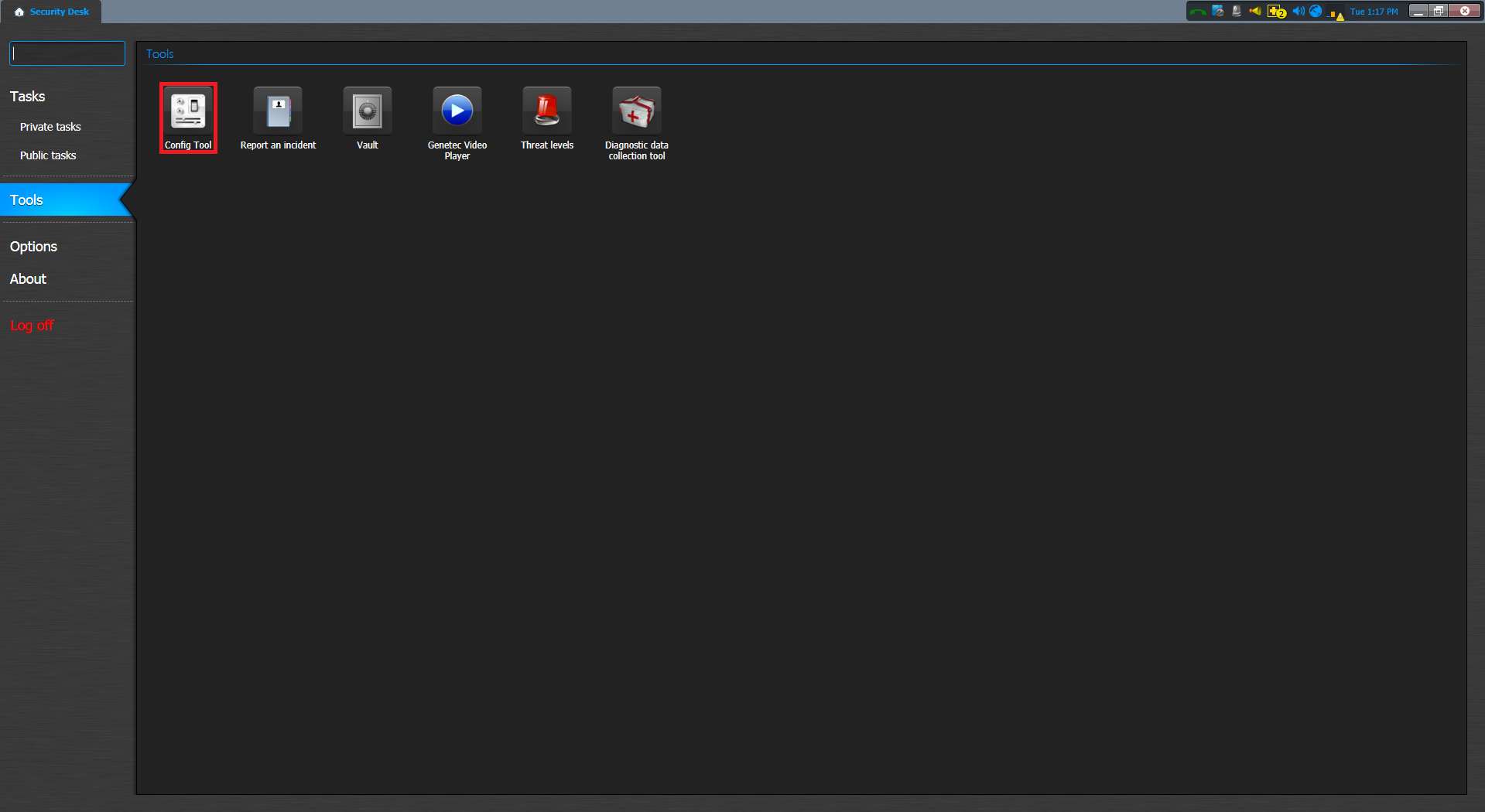 Open Genetec Security Desk: Click Start > All Programs > Genetec Security Center 5.1 > Security Desk. All Security Center client applications require you to provide a username, password, and the name of the Directory you want to connect to. Enter your Security Center username, password, and the server name (or IP address) of your main server. Click the Tools on the mode bar. Choose the Config Tool and this opens the Config Tool menu.