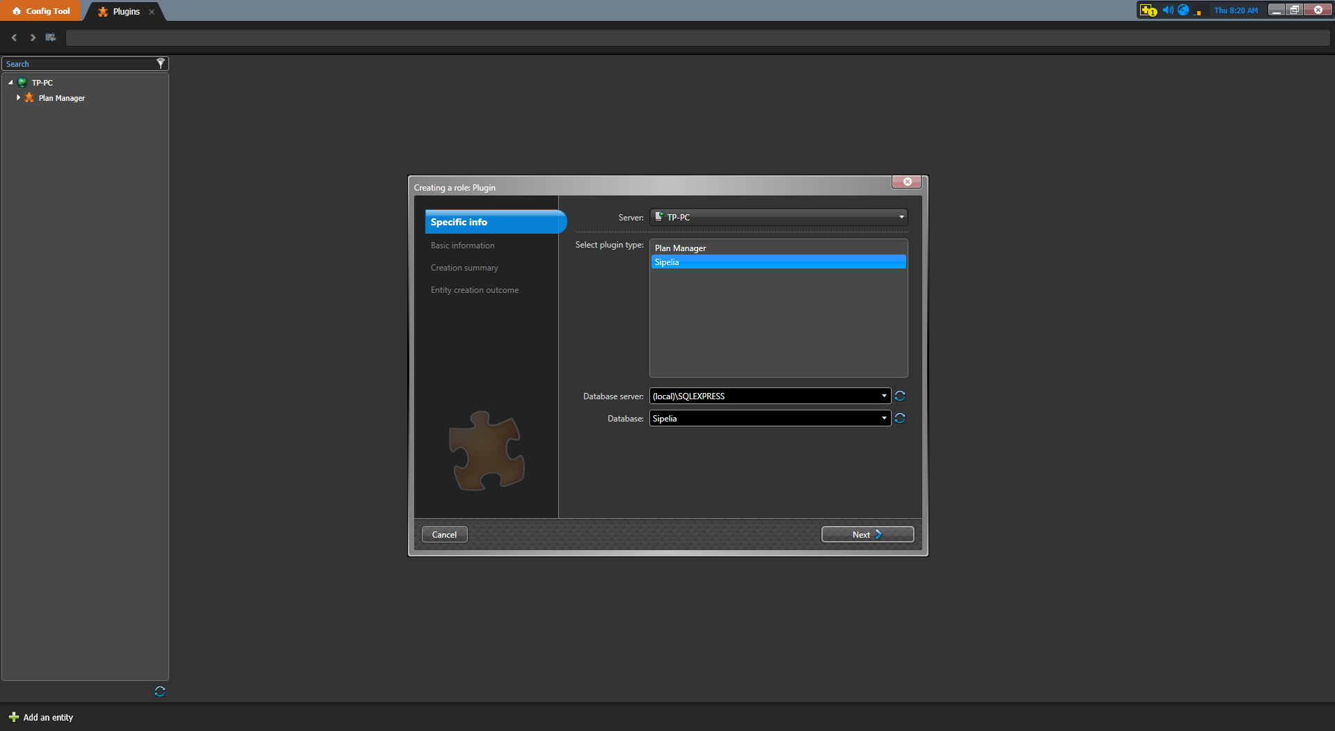 The Creating a role: Plugin wizard appears. In the Server drop-down list, select the server that is going to host the Sipelia Server role. In the Select plugin type field, select Sipelia. Enter the values for Database server and Database for the Sipelia database, or use the default values which are already provided. Click Next, enter the entity name and description, and then select the desired partition for this role. Click Next and check that the information that you have entered is correct. Click Create, and then click Close. Sipelia appears in the list of Plugin roles. It might take a few minutes for the role to create its database.