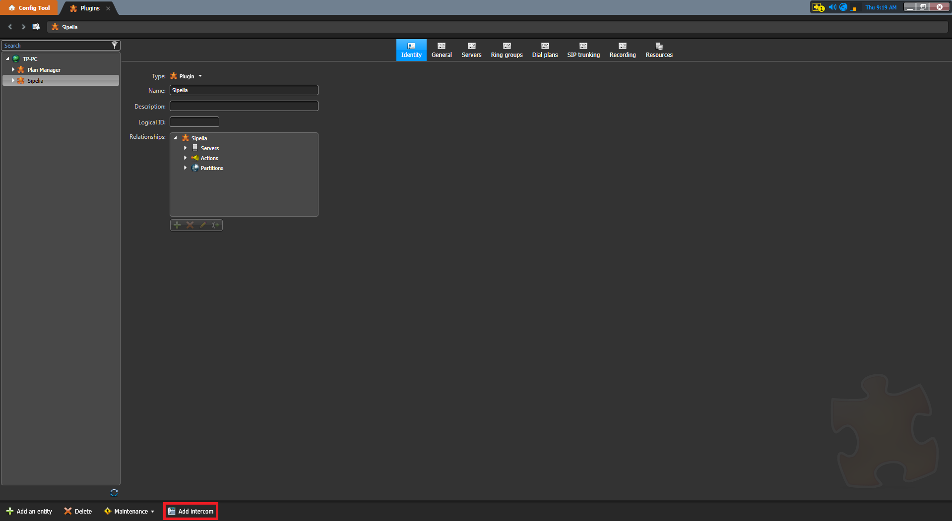 To add a SIP intercom: Open the Plugins task. Select the Sipelia Plugin role. At the bottom of the page, click Add intercom.