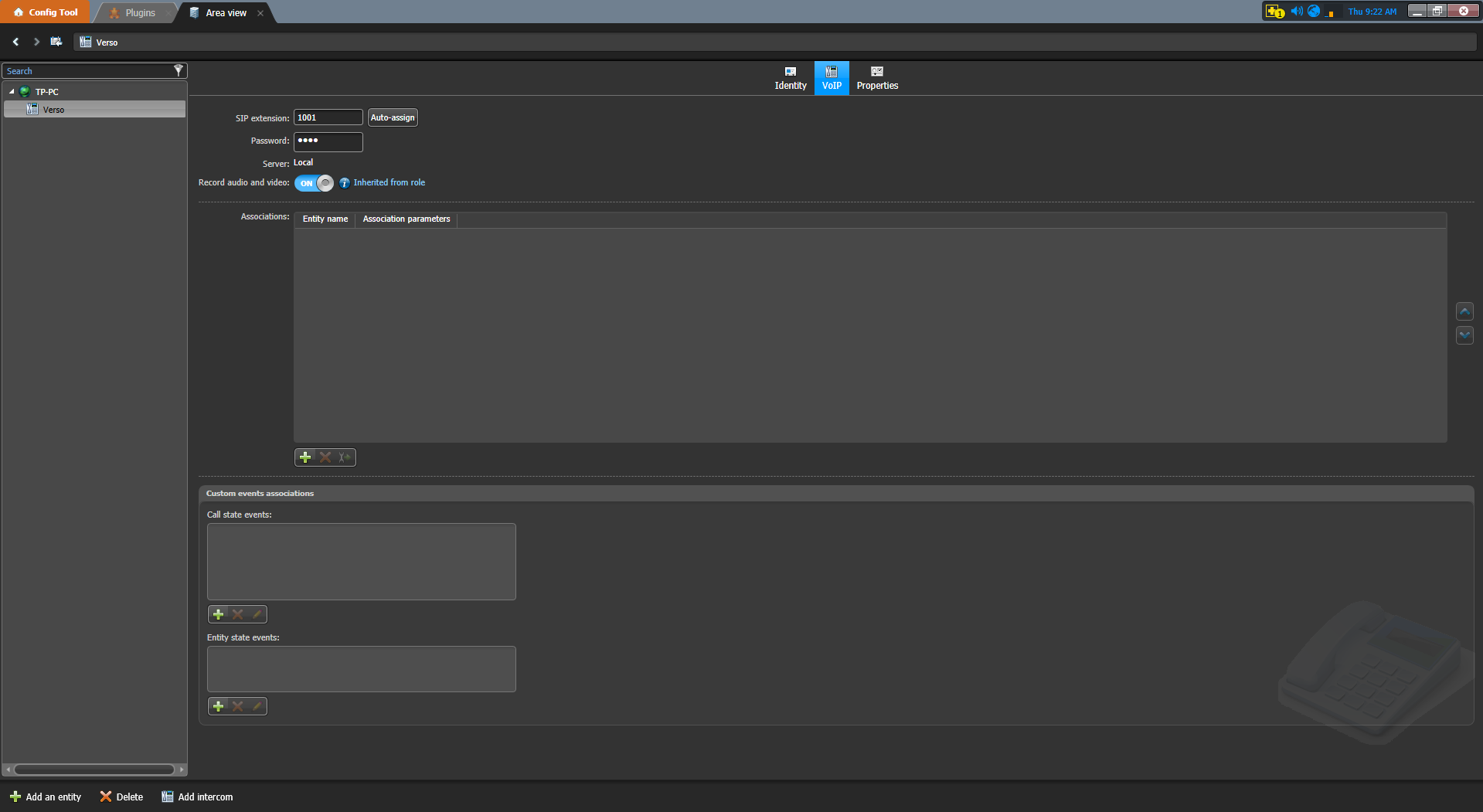 Enter a descriptive name for your SIP intercom, and then click Add. The Logical view task opens, and the intercom you added appears in the list of entities. Click the VoIP tab to set up this SIP entity as a SIP endpoint. Assign a SIP extension to your SIP entity in one of the following ways: Click Auto-assign. Auto-assign automatically assigns the SIP entity the next available phone extension in a given range. As a result, it is the recommended way of assigning a SIP extension to users, ring groups, and SIP intercoms. Simply click this button, choose an existing range, and then click Apply. Set the following: Record audio and video: Allows you to record the call sessions that the SIP entity participates in (either caller or recipient of a call). Once recorded, sessions can later be reviewed and exported through the Call report task. The default value is inherited from the global recording settings which are found on the Recording page of the Sipelia Plugin role. Changing this setting at the entity level forces the entity to no longer inherit the value from the global setting, thus allowing you to turn recording on or off for only specific entities, without affecting all of them. Click Apply. Add additional SIP intercoms by repeating the steps above.