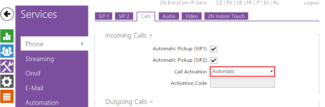 5. In Calls bookmark set Automatic Pickup for used SIP and Call Activation set to Automatic