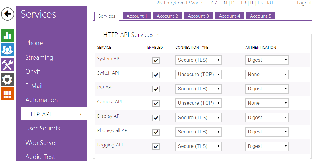 HTTP API/Services set the Switch API and Camera API like Unsecure (TCP) and set Authentication to None