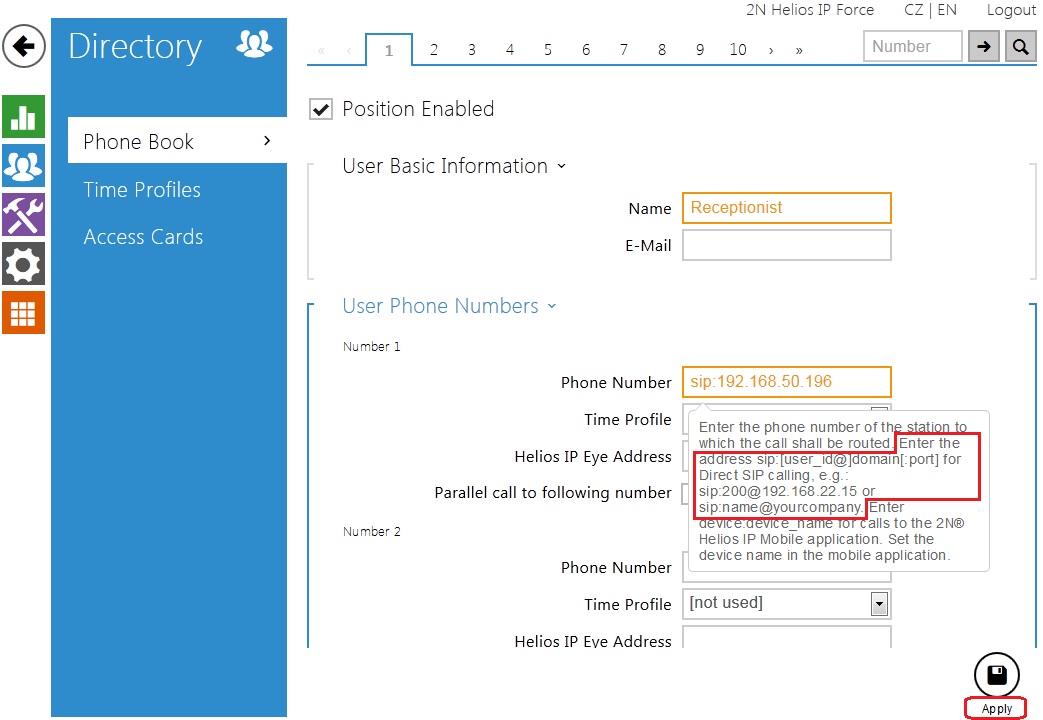 Settings of 2N IP Intercom is very easy. First of all create a new user and assign him a phone number – we will make SIP direct call (peer-to-peer call) to GXV3240 in our scenario. Therefore the number is set in the format: sip:IP_address (or sip:x@IP_address). See the picture below for more information.
