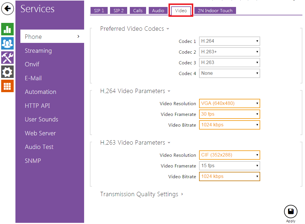 Finally we will modify the settings of Video codecs (section "Services – Phone – Video"). You can set the highest possible resolution (VGA or HD which is available only for