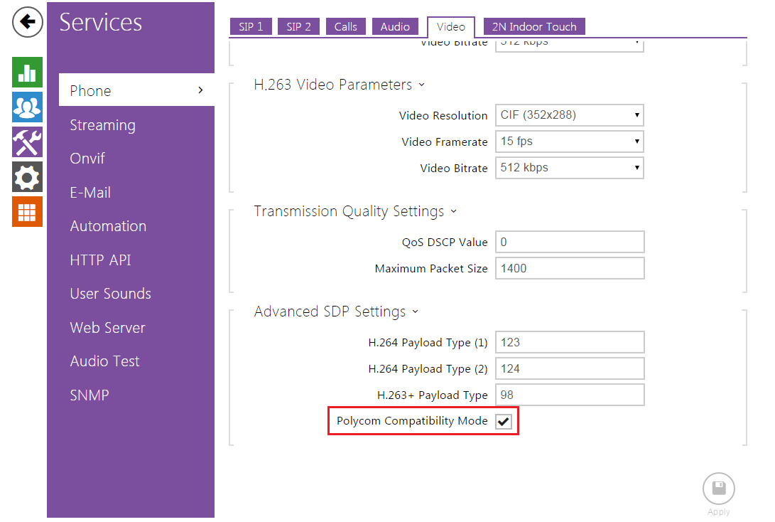 Services->Phone->Video and enable parameter Polycom compatibily mode.