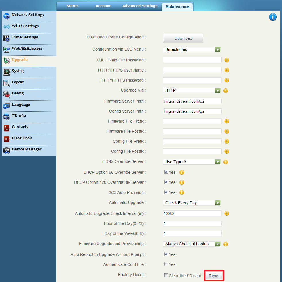 The easiest way how to set up this IP phone is via web interface but you can also use touch screen of this phone and set all necessary parameters this way. Complete setting via web interface is described below. All settings are done after factory reset which is available in the "Maintenance/Upgrade" section.