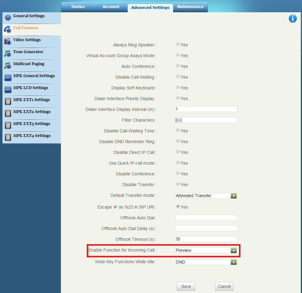 For the activation of the "Video Preview" function, which shows the video from the intercom before picking up the call, you need to enable it in the Advanced Settings -> Call Features menu as seen in the next picture. This function is available for several phones at the same time.