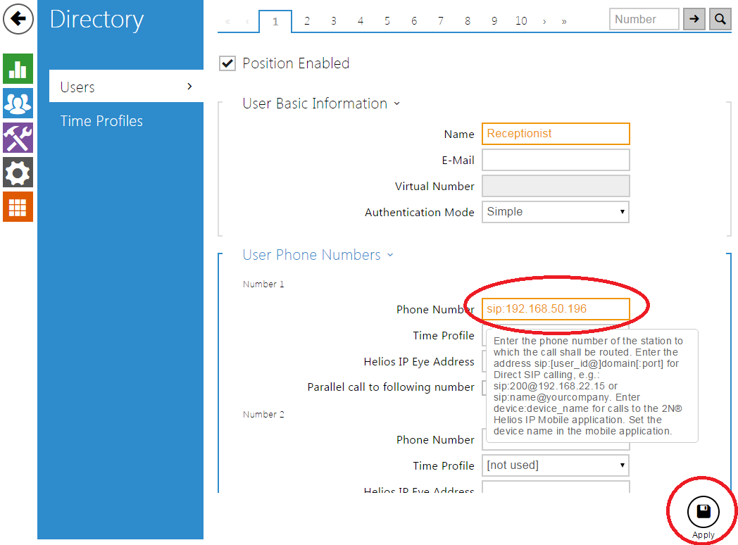 Settings of 2N IP Intercom is very easy. First of all create a new user and assign him a phone number – we will make SIP direct call (peer-to-peer call) to GXV3275 in our scenario. Therefore the number is set in the format: sip:IP_address (or sip:x@IP_address). See the picture below for more information.