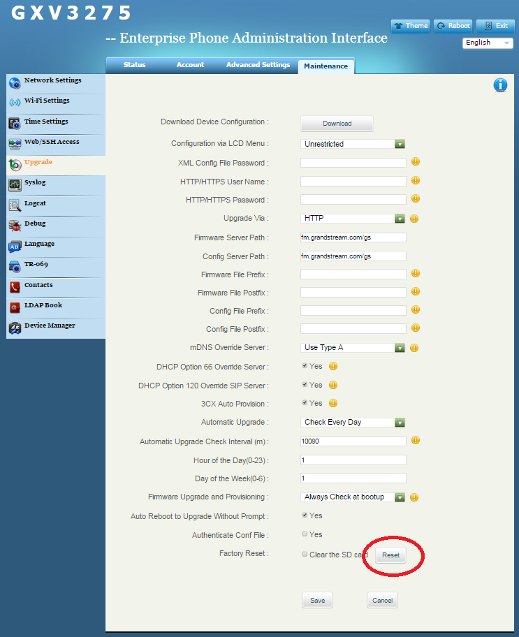 The easiest way how to set up this IP phone is via web interface but you can also use touch screen of this phone and set all necessary parameters this way. Complete setting via web interface is described below. All settings are done after factory reset which is available in the "Maintenance/Upgrade" section