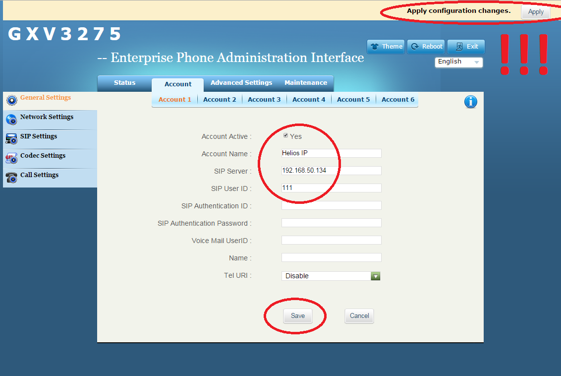 Than you have to enable "Account 1" and set all necessary information for this account in the "General" section. We will set peer-to-peer connection between 2N IP Intercom and GXV3275. Therefore set the IP address of the intercom into the "SIP Server" field as shown in the picture below. Authentication ID and password aren´t used in this case.