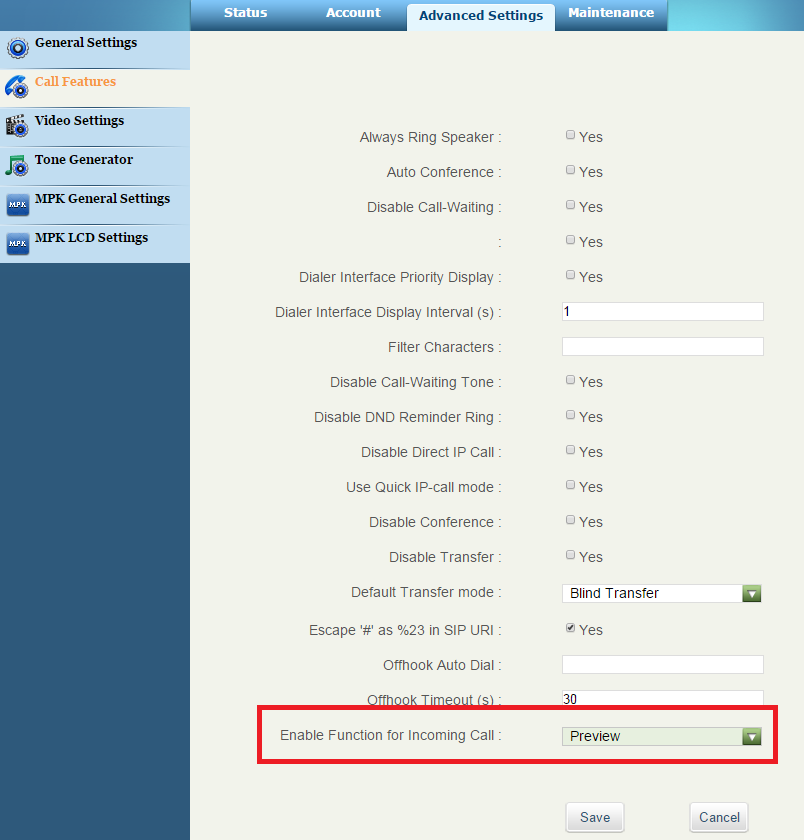 For the activation of the "Video Preview" function, which shows the video from the intercom before picking up the call, you need to enable it in the Advanced Settings -> Call Features menu as seen in the next picture. Video Preview for model GXV3275 is supported in FW version 1.0.1.50 and newer. This function is available for several phones at the same time. It also works with using My2N services.
