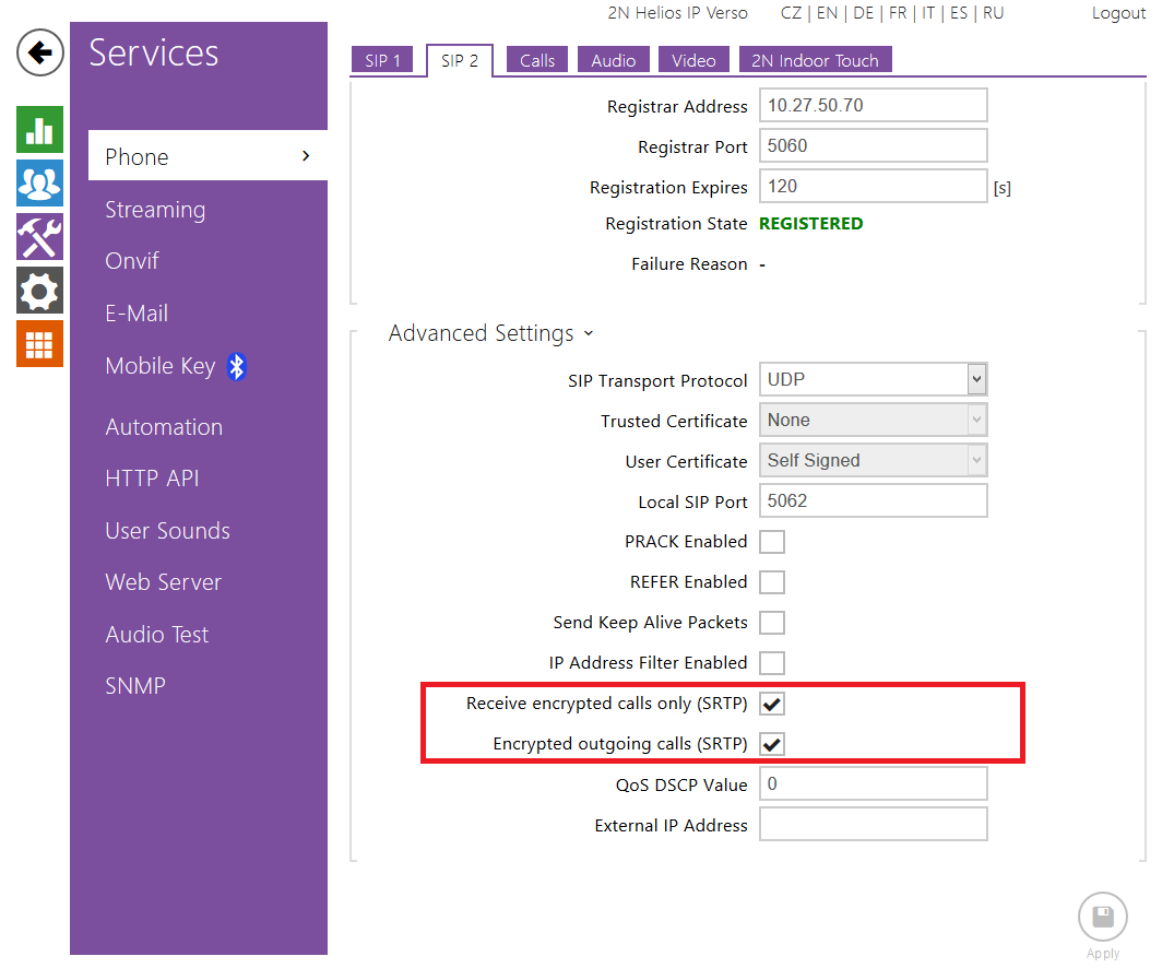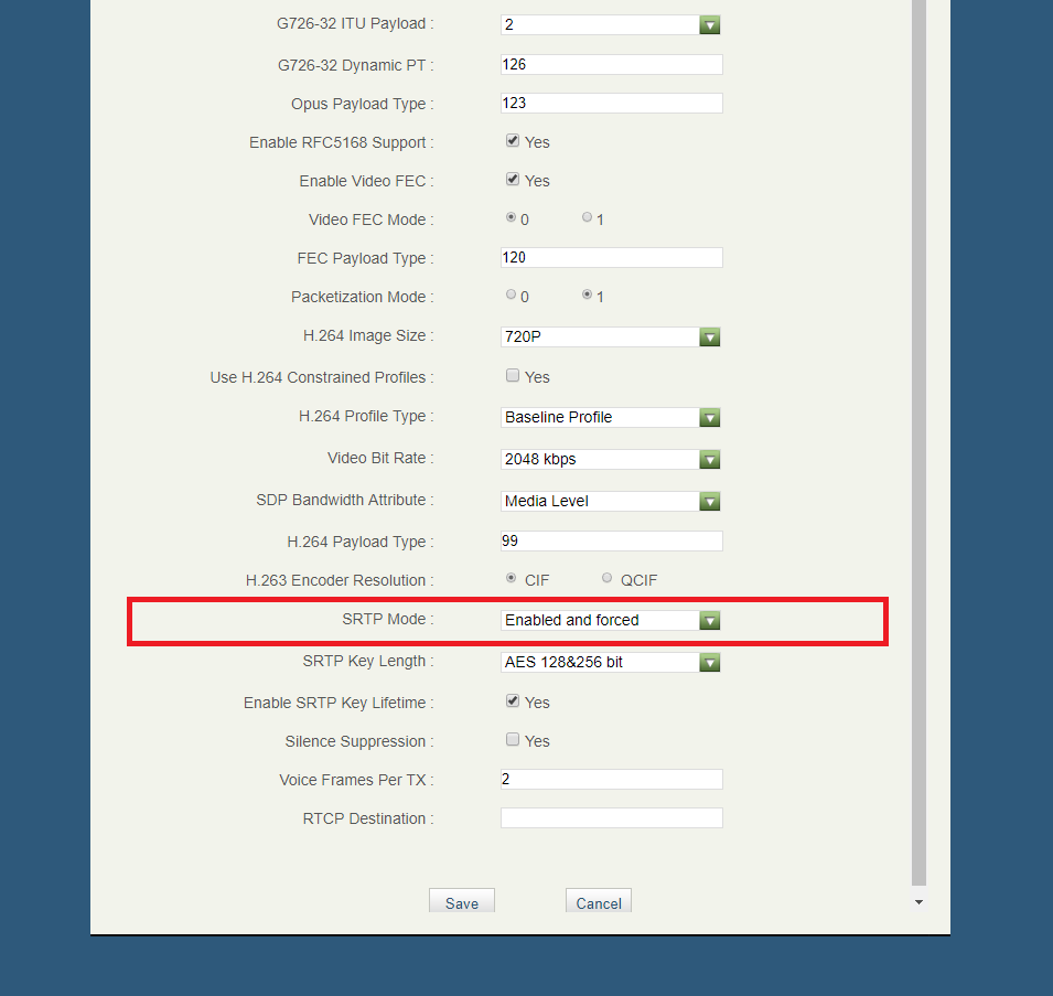 2) In the next step we will modify the settings of Video codecs (section "Services – Phone – Video"). You can set the highest possible resolution (VGA or HD which is available only for
