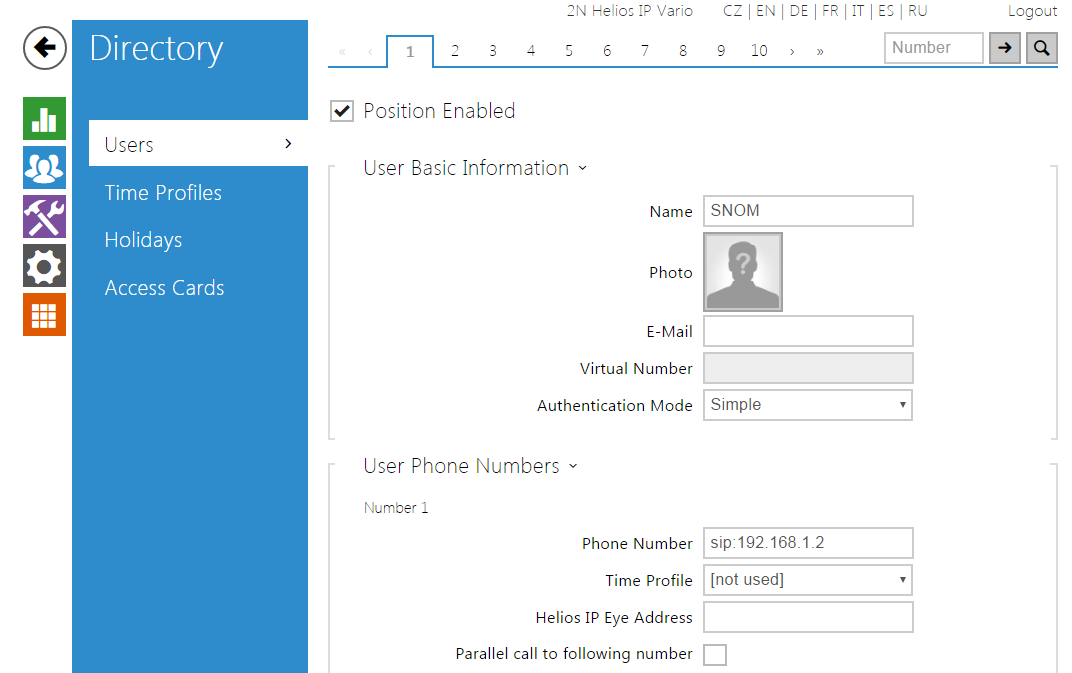 In next step open the web intarface of the SNOM phone and go to section "Operation->Directory" and to field "Number" fill the number from the first step (in this case 111). To field "Action-Url" fill "http://ip_address_helios/enu/snom760-video.xml"